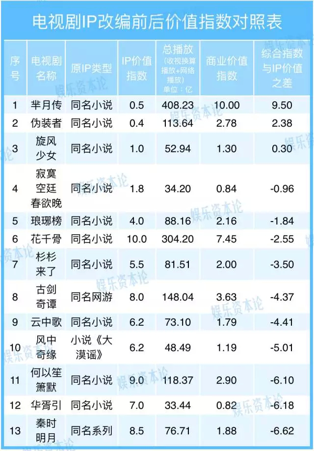 娱乐资本论整理了2014年“IP热”以来,由IP改编而来的电影、电视剧和网剧,并分别计算出本身IP的价值指数和改编后的商业价值指数,来看看有哪些被浪费的IP,以及是否IP就真的能保证变现。