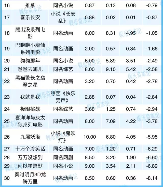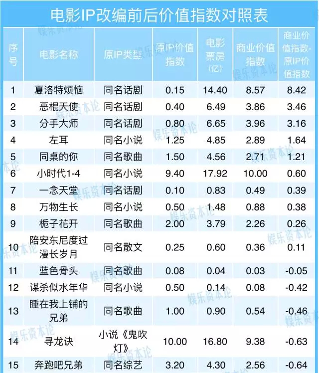 娱乐资本论整理了这30部IP电影的各项价值指数,并根据电影的相对商业价值指数与IP价值指数的差值进行排序,也就是IP改编前后性价比由高到低的排序: