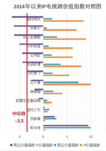 电视剧类按照点击量进行排名(其中收视率按城市收视人口数乘以集数,换算成网络播放量),确定《芈月传》商业价值指数为10,其他电视剧根据收视率和网络播放量进行比例换算