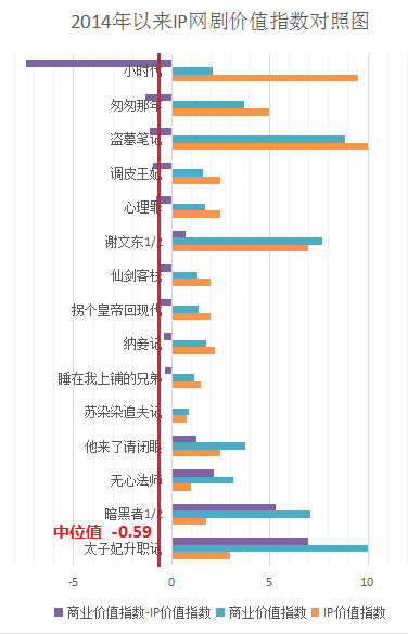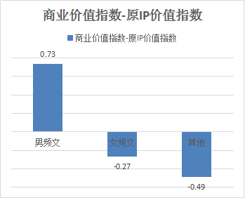 在女频IP中,我们可以看到《太子妃升职记》异军突起,也可以看到《小时代》惨遭失败,相差较大。女频的商业价值指数与原IP价值指数之差低于男频,不过这并不意味着男频性价比更高,只是男频往往量级更高。普遍来说,针对女性的网剧往往性价比高,投资小,风险低。