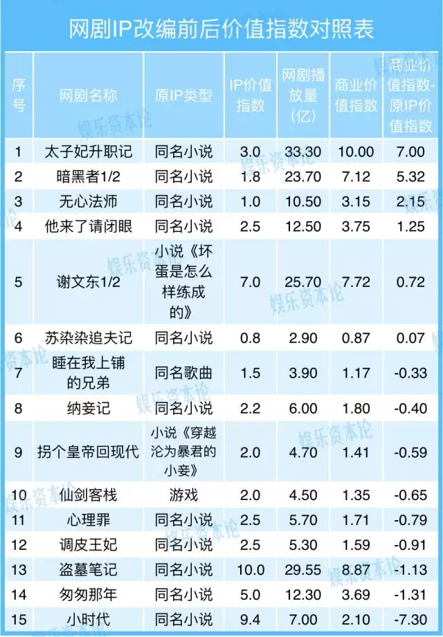 除了《小时代》,其他IP网剧在同一标准下基本发挥了IP价值,少有浪费IP的现象。反而是网剧时常给原著带来更高的曝光,《太子妃升职记》便是典型,IP价值放大了50倍不止。