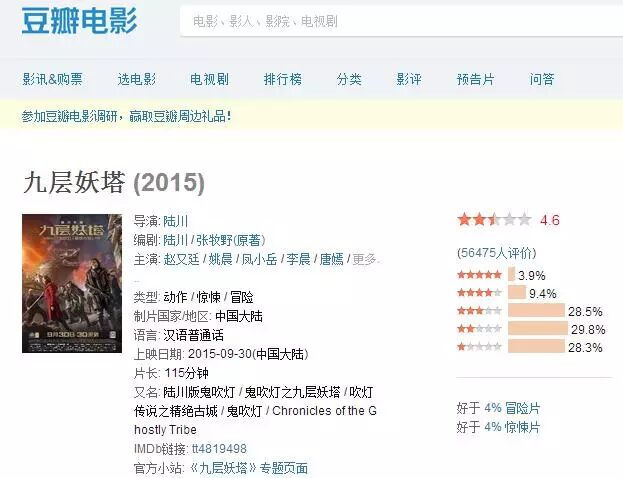 10月20日,距离《九层妖塔》距离下映还有一个星期,距离《鬼吹灯》改编的另一部,也是真正由天下霸唱担任编剧的影片《寻龙诀》上映还有55天。