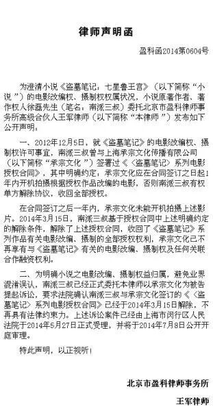 的确,除了《九层妖塔》之外,此前,《盗墓笔记》的改编方和原著南派三叔之间也产生了矛盾。去年6月,南派三叔委托律师发表律师声明函,宣布已经收回原授予上海承宗文化传播有限公司的《盗墓笔记》电影改编权、摄制权,原因是对方未履行合同如期开机拍摄。