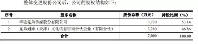 目前,华谊兄弟持有华谊创星53.14%股权,是公司控股股东;兄弟姐妹(天津)文化信息咨询合伙企业(有限合伙)持有46.86%股份,该公司的出资人几乎都是华谊创星的员工。胡明在兄弟姐妹持有73.7%,是最大的股东。