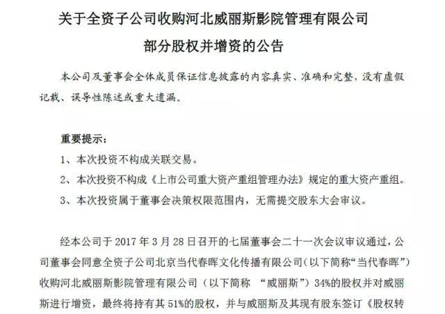 今年3月,当代东方曾公告称,将收购位于石家庄的河北威丽斯影院管理有限公司(以下简称威丽斯),根据威丽斯的董事、创始人石辛栋的说法,当代东方的承诺包括:1、先投入1470万拿下威丽斯34%股权;2、再增资1496万取得51%的控股权;3、最后支付3000万作为财务支持,用于公司项目建设。