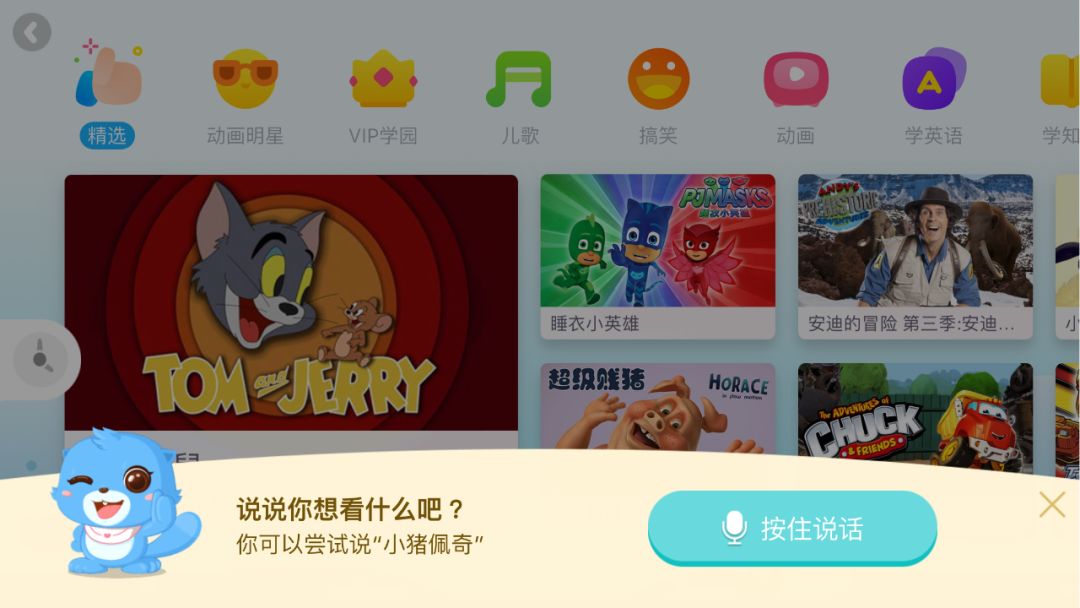 右下角的卡通形象,目前支持语音搜索,专为不太会用文字搜索功能或是不太识字的孩子设计,针对儿化音做了增强识别。同时珞林透露,目前已经在做产品升级,将语音搜索进一步升级成成长陪伴。