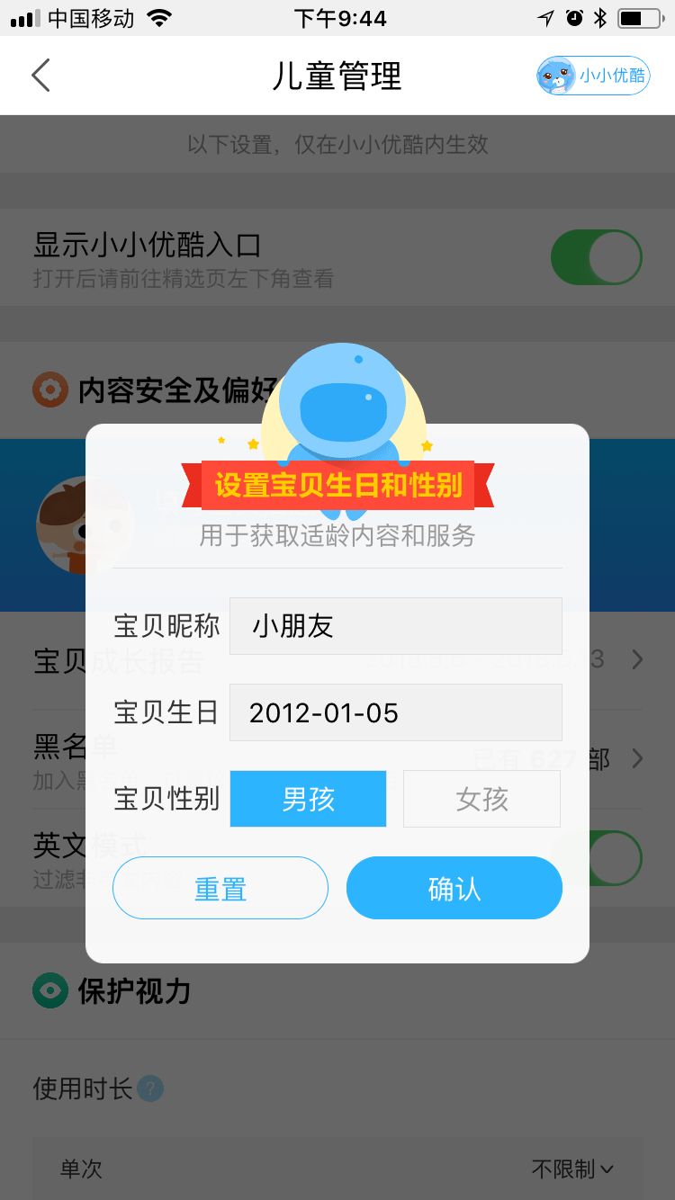 儿童管理是优酷APP里个人服务的一个部分,家长可以在此进行个性化的设置,如下图: