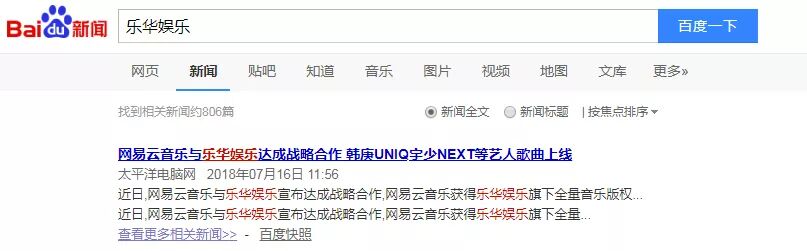 百度新闻搜索“乐华娱乐”,首条就是乐华娱乐艺人歌曲上线网易云音乐