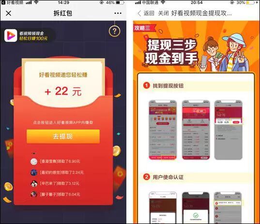 比如前段时间在好看视频上线的“收徒赚钱”活动,即为鼓励用户去拉新用户下载好看视频,用户成功收徒之后,可获得现金奖励。