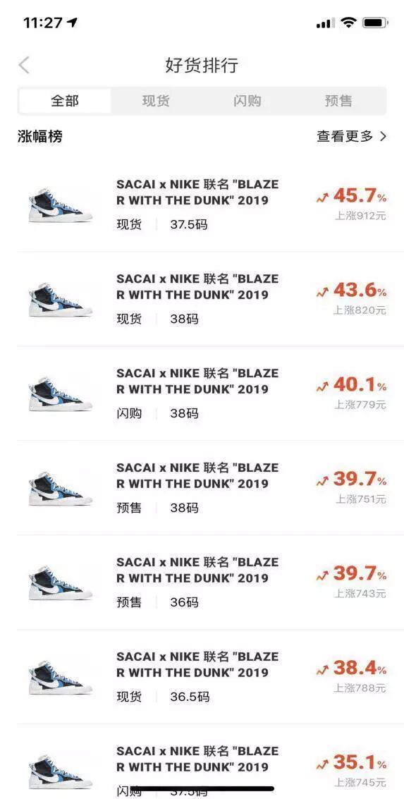 6月13日,在《中国新说唱》宣布定档日期后,小光在微信上发来了球鞋交易平台nice上的一个截图。根据网络流传图,吴亦凡在节目上穿了一双SACAL×NIKE联名款的球鞋,定档消息一出,这双鞋在二级市场的上涨率直奔50%。
