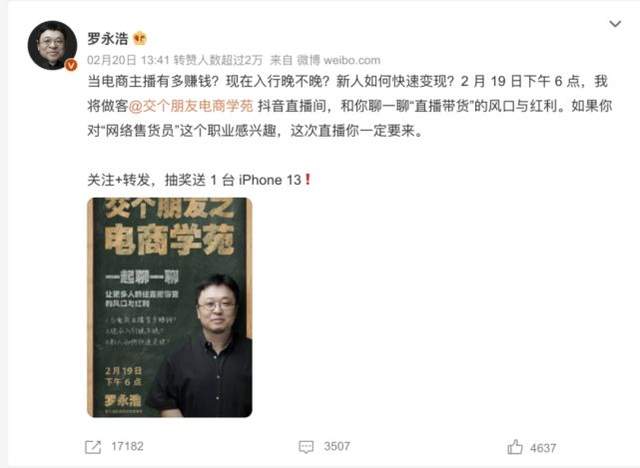在2月19日的直播中,罗永浩官宣了自己“交个朋友电商学苑名誉校长”的身份,“正牌校长”则由原新东方副总裁李亮担任,并称二人是直播电商行业和培训行业的“两块天花板”,他们共同的“老领导”俞敏洪,直播带货首秀一晚仅卖出价值450万元的农产品,不及罗永浩首秀1亿GMV的3%。