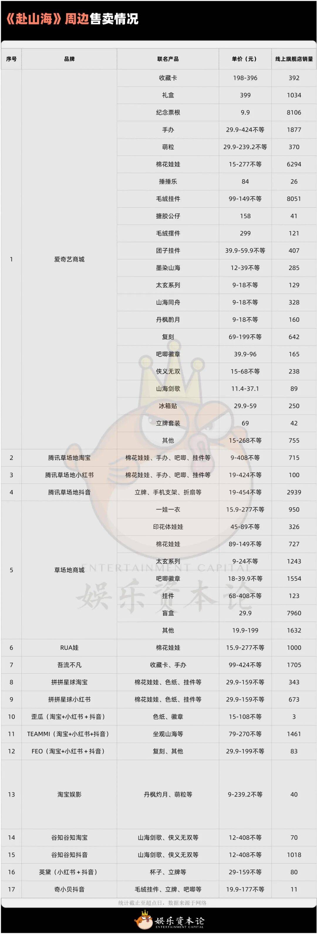 《赴山海》的IP衍生开发采用“产品多样化+渠道全覆盖”策略,通过周边产品矩阵与跨界品牌联动,精准触达泛娱乐消费群体,据网友统计最终推动IP衍生+联名产品销售规模达3000万元。