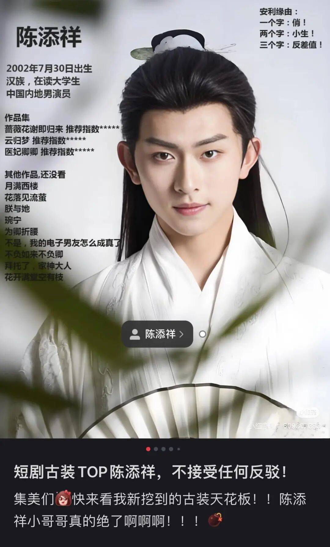 凡酷文化的签约演员里,陈添祥是今年人气增长势头最猛的短剧男演员之一,他和岳雨婷三搭主演的《月满西楼》《蔷薇花谢即归来》《双面权臣暗恋我》,让男女主都成了短剧头部,其白发造型在短视频出圈,到目前红果粉丝数已突破120w。