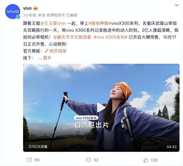产品开售的宣传微博中,vivo X300系列喊出了“2亿人像超清晰,旅拍何必带相机”的广告语,并且联合张晚意、王玉雯、蒋奇明等明星打造的广告,也着重强调旅拍功能。此外,在vivo X300系列的详情页,vivo还着重介绍了该产品支持480mm+超远距运动抓拍,是“观赛新神器,赛场高光一拍即得”。