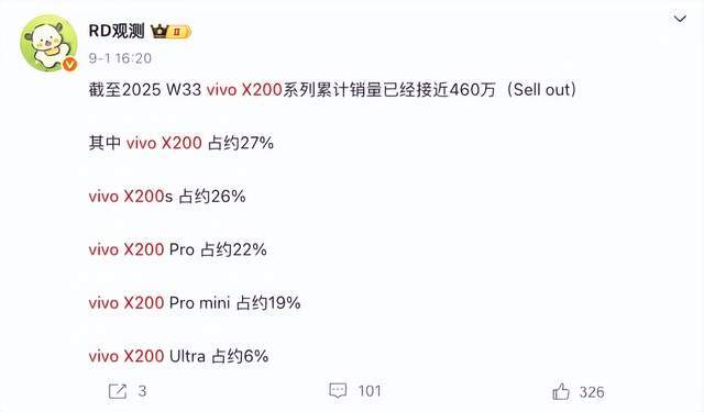 究其原因,主要是因为,“演唱会拍摄”并非大众需求,vivo固然能在垂直赛道彰显竞争力,但却难以真正“破圈”。RD观测披露的数据显示,截至2025年第33周(截至8月17日),vivo X200系列累计销量约460万台,其中vivo X200 Ultra占比约为6%,销量仅约27.6万台。