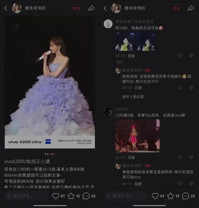 在小红书平台,诸多网友均热衷于分享使用vivo X200 Ultra在演唱会的拍摄体验。而在评论区,则有网友分享使用iPhone拍摄同一场景的模糊照片,感叹苹果的长焦拍摄能力不敌vivo。