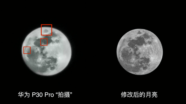 然而,爱否科技评测华为P30 Pro时却发现,该产品拍摄的月亮似乎是P上去的。前爱否科技主笔王跃琨在评测中表示,华为P30 Pro会根据已知的月亮信息,P上相应的细节,甚至把月亮“修改”之后,它还能一一还原。