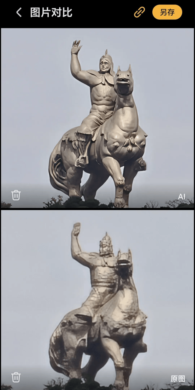 更有甚者,有用户手握荣耀Magic7 Pro超远距离变焦,拍摄泉州郑成功雕像时,原片糊成了一团。经过AI计算,荣耀Magic7 Pro输出了清晰的照片,但人脸和马脸的线条拧成了一团,完全失真。