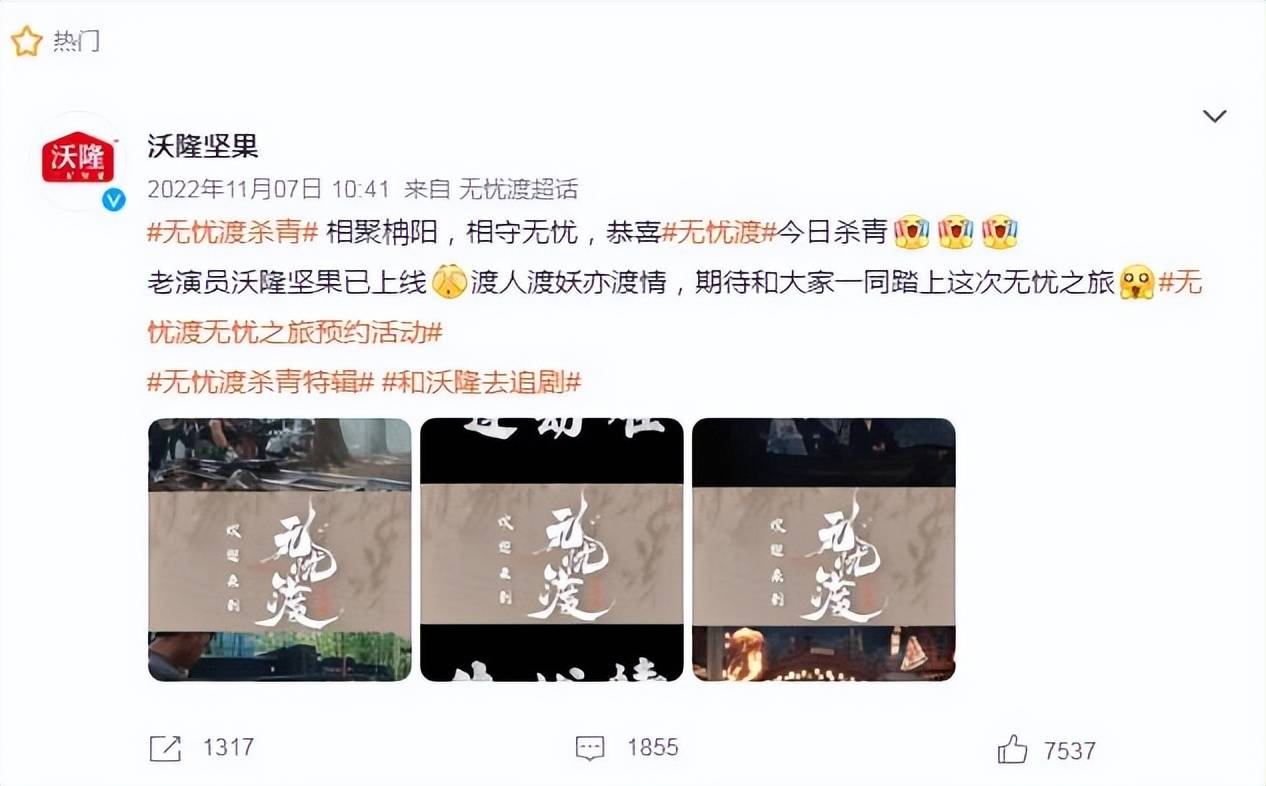 三年前,沃隆坚果在《无忧渡》杀青日联动微博,此后品牌持续在剧集超话打卡、配合物料推广,几乎是以绝对的信心对该剧进行了前期“押宝”。但是随着宋祖儿的税务风波,《无忧渡》的播出遥遥无期,沃隆坚果官方微博在剧集超话的每日打卡也最终停在了196天。