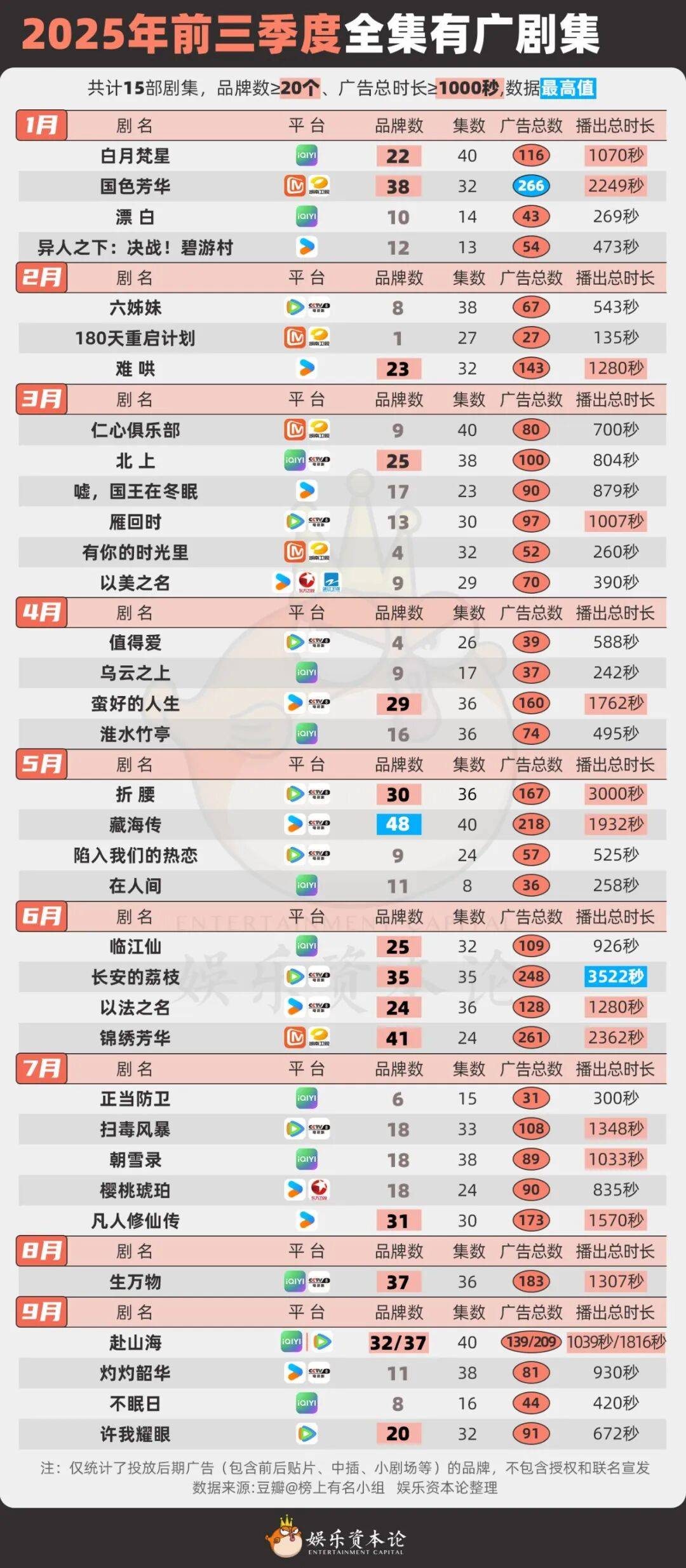 头部项目的商业价值依旧稳固,中腰部剧集的“裸播率”明显上升,“零广开播”剧集虽然不多,但不少A级剧都在开播首日后就一路“裸播”至结束。投广品牌1到3个、广告播出总时长白秒之内的情况已是常态。