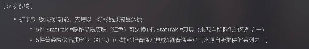 可使用五件隐秘品质(红色)枪械皮肤,合成并保底获得一件刀或手套类饰品。