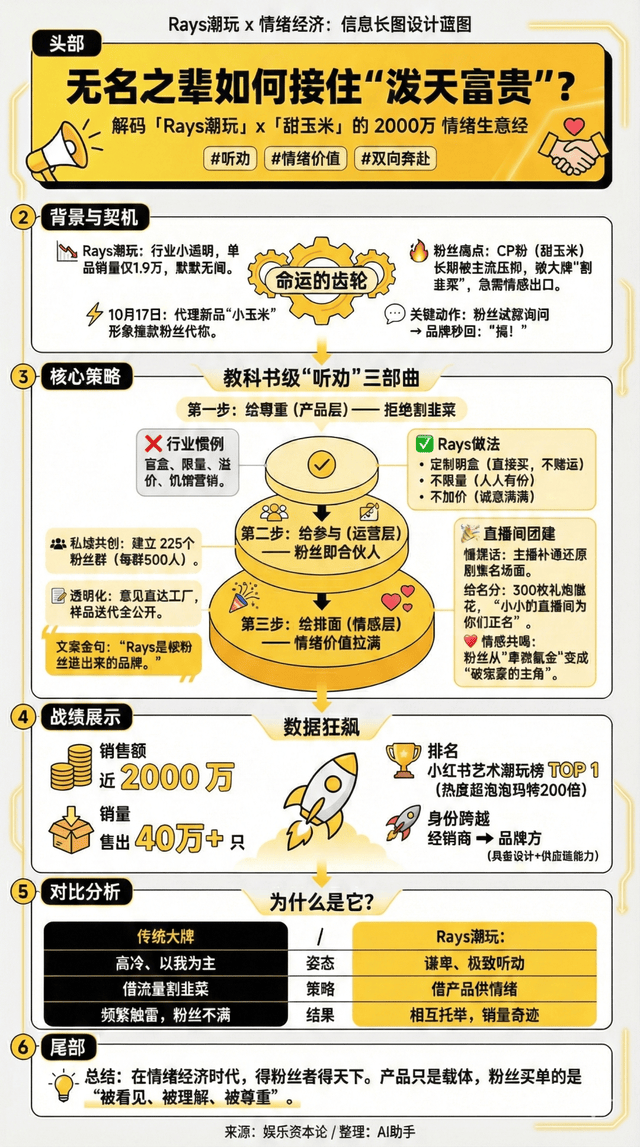 “真诚的人真的活该赚大钱”,粉丝们在评论区中纷纷表示。「Rays潮玩」推出的定制款「甜玉米」的销量也随之攀升,至发稿为止,已售出超40万只,或为品牌带来近2000万元收入。