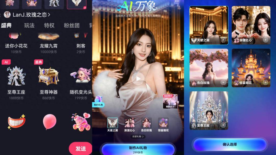 娱乐资本论观察发现,当前AI万象系列礼物并没有独立版块,也不位于核心的推荐位,只是在一众礼物中具备小小的“AI”角标提醒。在两个月的不断调试完善中,第一期AI万象迭代出数个新模版,目前,几款比较受用户喜欢的模版分别为天使之翼、告白玫瑰、惊喜烟花、浪漫比心和至尊王座,标价从299快币(29.9元)到1888快币(188.8元)不等。