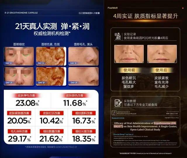很多麦角硫因口服品牌虽然都标准了清晰可量化效果,例如“-40.17%鱼尾纹数量”、“+28.47%胶原蛋白”、“清楚82%自由基”、“50%毛孔改善”,但这些数据从何而来、是否有严谨的科学实验,需要打个问号。有些品牌还贴上了效果过分显著的“使用前后”的实验对比图。