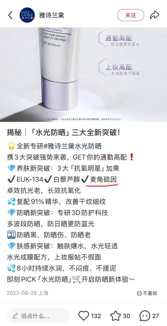 早在2022年,雅诗兰黛就在防晒、粉底中添加了麦角硫因,其贵价“白金级奢宠蕴能黑钻奢华面霜”里,也含有麦角硫因;