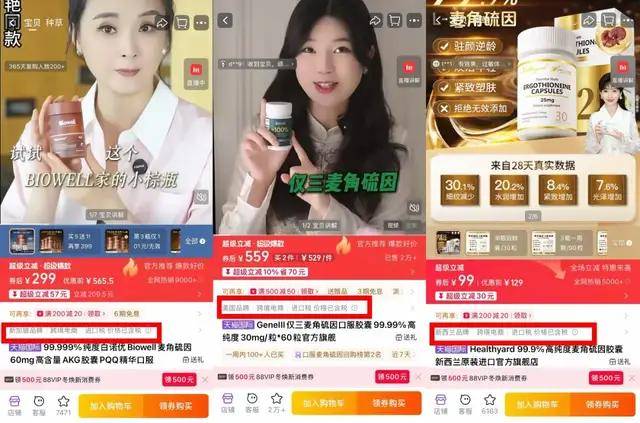 这些达人博主的话术重点则是更直白的功效卖点,反复强调麦角硫因的含量、浓度、研发背景、海外认证等,还会附上所谓的一个月测评,用显著对比来吸引用户;这些博主的内容中,也会频繁出现“明星都在吃”的话术,来强化信任感。