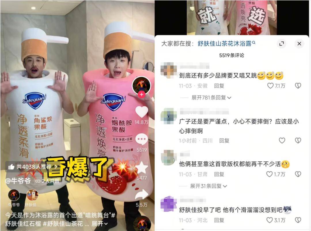 这几则广告创意,同质化采用了《技能五子棋之歌》的唱跳元素,只是单纯在广告词上做了替换式创新,本质上与品牌产品的关联度不足,比如舒肤佳的广告片中就只是简单将品牌卖点尬唱了出来,用户无法直观看到“技能沐浴露”嫩滑、不拔干等功效,且此类型广告看多了很难不产生疲劳感,有网友发出了调侃式质疑,“到底还有多少品牌要又唱又跳”。