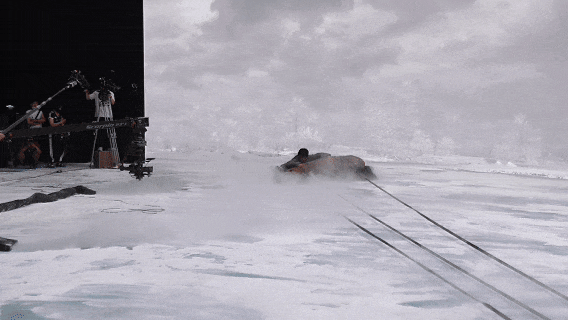 其实主要难在方案设计上,怎么在一个冰面上做出一个深坑,深坑里边还要蓄水,而且整个冰面一开始是完好的,人打着的时候还能掉下去。这个里边涉及到很多工程建筑方案,比如怎么用威亚把人拉进水,LED屏幕怎么配合它。以前这种戏放在虚拍都不太可能,因为动作戏太多,难点太多,又有水又有冰。所以我们虚拍整体解决方案就可以很好的解决这个难题,现在国内很少有人能做到这种程度。