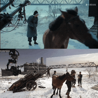 挑战最大的是掉进冰窟窿的两场戏,这在之前的制作环节中是很难想象的。一场是人和马一起掉进冰窟窿,一场是两人打架,最后一起从冰面掉入水中。以前得用绿棚,用大量视效去做,但这次我们和导演沟通完拍摄的机位后,根据这些方向设定整个场景的建筑方案。