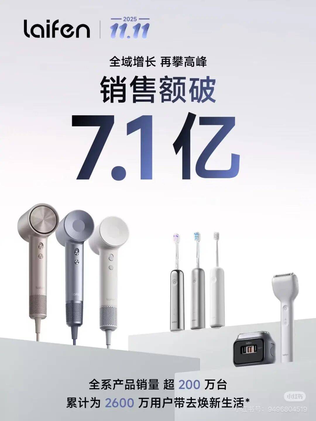 2022年至2024年,徕芬双11「全网」GMV分别是2.9亿元、4.4亿元、5亿元,期内增速从51.7%降至13%。2025双11稍微喘口气,「全域」销售7.1亿元,吹风机还是行业第一,新品剃须刀也在多个数据维度拿到第一,但统计维度从「全网」变成「全域」,值得玩味。