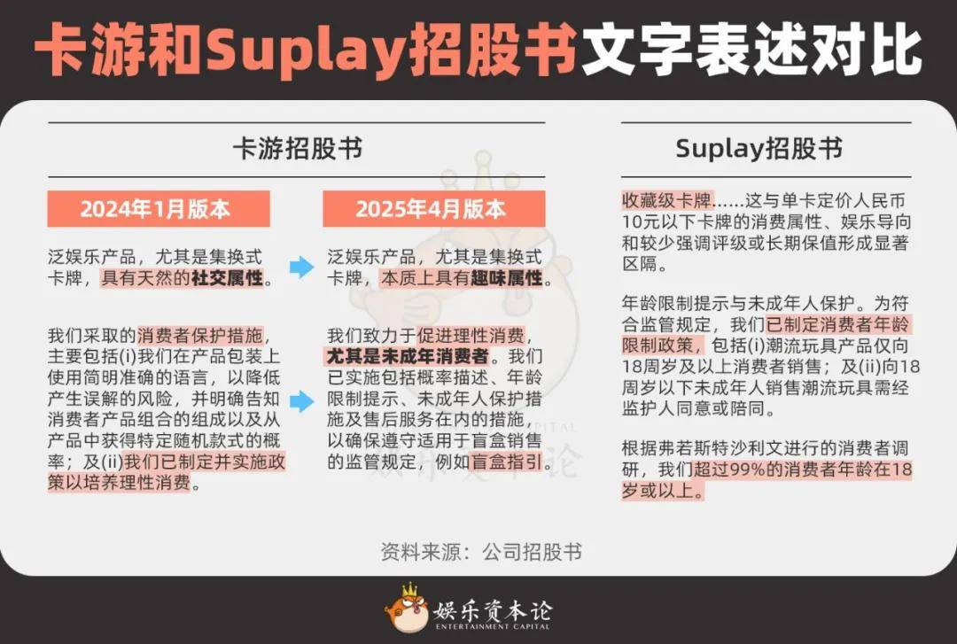然而,卡游第二次冲刺IPO仍以失败告终,使得其他同行不得不选择更加谨慎的表述。以同属于卡牌赛道的Suplay为例,Suplay在财报中反复强调自己的收藏卡产品与“单卡定价人民币10元以下卡牌”的“消费属性、娱乐导向”完全不同,并多次强调自己的消费者“99%以上是成年人”,几乎是明示要将自己和卡游划清界限。