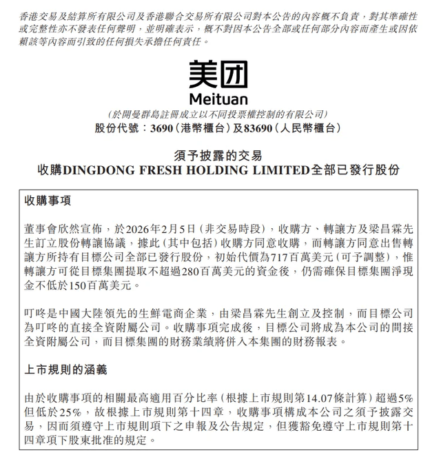 2月5日,美团于香港联交所发布公告,将以约7.17亿美元的初始对价,完成对叮咚买菜中国业务100%股权的收购。