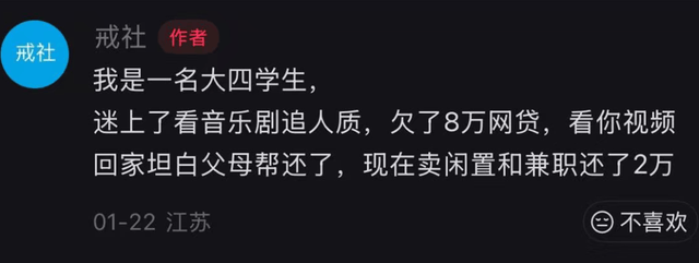 有网友给聚焦于记录赌徒与网贷者的人生经历的民间组织“戒社”发文,讲述自己为了音乐剧演员一掷千金,从偶尔看一场,到追求全勤,最后走上借贷的荒唐之路。而音乐剧演员们,也开始享受过去爱豆们的待遇——有人制作物料及行程,还有人在散场后等待演员下班,只为了送上礼物。