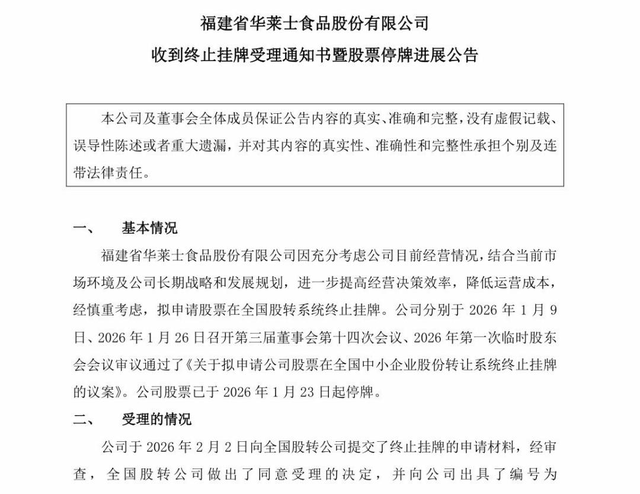 令人意外的是,今年春节前夕,华莱士一面大举庆祝自己的25周年生日,一面拿出了退市申请:2月2日,品牌母公司华士食品向新三板提交终止挂牌申请,随后正式进入退市程序。