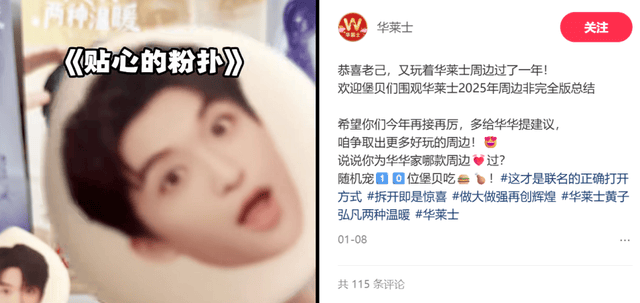 在2025年的周边总结中,华莱士将自己的联名周边分为精致收藏、抽象造梗和采用粉丝创意三个方向。官号经常鼓励粉丝用周边拍摄抽象视频:印上代言人大头的粉扑可以用在脸上“献吻”、被压扁尖叫的悲伤蛙玩具被用来拍“老板与我”、采纳粉丝建议做成毛绒的粉色汉堡和白桃啤玩偶,可以骑着玩具电动车原地“兜风”假装踏青……IP虽然不贵,但策划开发可谓“物尽其用”。虽然华莱士在精致收藏类周边的赛道上卷不过其他价位更高、对工艺和柄图投入更多的品牌,但抽象和听劝也是一种四两拔千斤的流量密码。