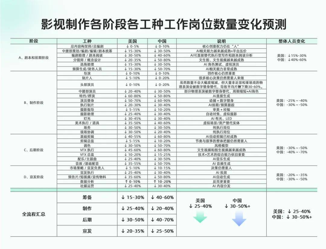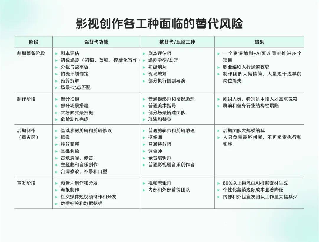 随着AI真人大量占据影视作品,对真人演员的需求整体上会大幅缩减,其中头部演员的单项目工作时长和收入模式会发生结构性改变,前端固定收费将会明显下降;中腰部演员会被大面积挤压和替代;群演和替身行业基本消失;新人入行路径会发生显著变化。
