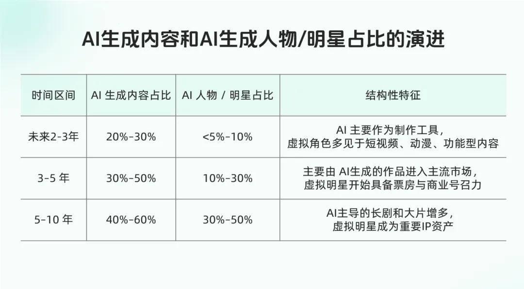 纯由AI生成或者主要由AI生成的故事、场景、人物和演员会占据娱乐产业的半壁江山,其中甚至有可能会出现超级IP和超级巨星。伴随着这一变化,影视制作行业需要从“内容成品思维”转向“IP资产思维”,AI生成的故事、场景、宇宙观、人物、演员、道具和服装都会成为重要的核心IP资产。