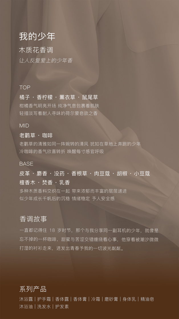 其中,“浮靡之水”与“我的少年”两款香型最为出圈。尤其是“我的少年”,凭借极具画面感的香调叙事,联动系列代言人王星越的形象,在宣传片中以午后阳光、木地板水渍、清浅呼吸等细节,调动感官、唤醒记忆,不仅让该香型深入人心,更成为独特艾琳品牌破圈的标志性范本。