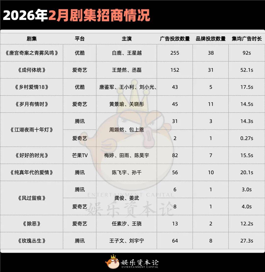 进入二月,优酷平台播出的古装悬疑剧《唐宫奇案之青雾风鸣》成为招商领域的头部剧集,广告数量达到255个,合作品牌数量有38个,单集18广创下优酷史冠,更出现“播出期持续加广”“投放效果远超预期”的盛况。尽管相较于一月头部《生命树》,二月整体剧集招商呈现分化态势,但《唐宫奇案之青雾风鸣》依旧稳居招商前列,凭借古代悬疑题材的独特性和强劲的女性群像内容,展现出头部剧集强大的商业号召力。