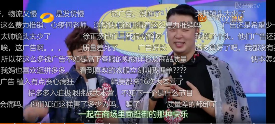 鉴于许多网友对于拼多多在《快乐大本营》的广告吐槽比较多,我们通过网友微博评论、弹幕评论,大约整理了以下几类:一是硬广时间长;二是拼多多音乐太洗脑;三是用户对拼多多产品质量持怀疑态度。