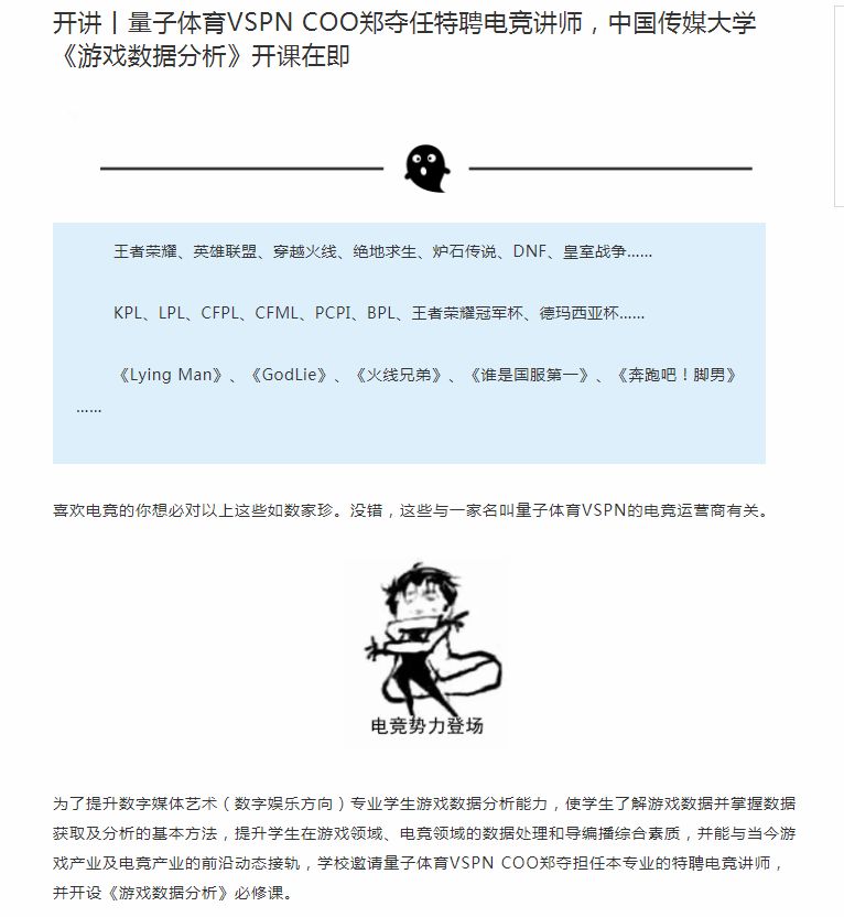 “面子大”的中传、上体就能请来量子体育VSPN的COO郑夺当授课老师,把中国电竞第一人李晓峰(Sky)找来当面试官。在学生中,郑老师的授课广受好评。校企合作的模式正在复制,腾讯电竞、完美世界、英雄互娱都在扩大与高校间的合作。