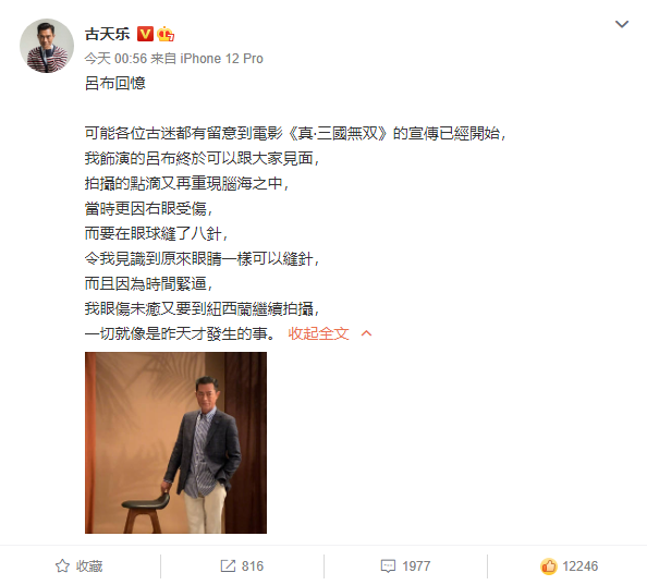 与王凯和韩庚相比,古天乐已经算得上是老戏骨了,出演电影版《真·三国无双》的过程中同样拼命。拍摄期间,古天乐曾经右眼受伤,眼球缝了八针。“当时更因右眼受伤,而要在眼球缝了八针,令我见识到了原来眼睛一样可以缝针。”因为拍摄紧张,虽然眼伤未愈,但古天乐很快就回归了拍摄工作。