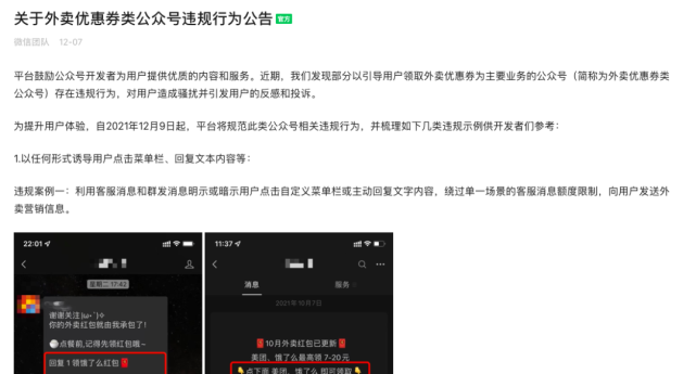 12月上旬,微信对外卖优惠券公众号进行了整改,不少外卖类公众号都被封禁。