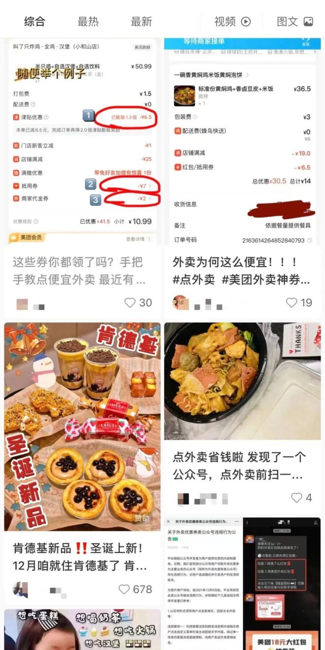 “外卖一定不要直接点,像我这样才是最香的,根本花不了多少钱,关注XX公众号,每天都可以领大额优惠券。”相似话术的视频在抖音动辄就会刷到,在小红书、知乎等社交平台上,外卖优惠券的广告也无孔不入。