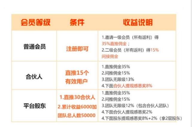 以公众号“外卖券儿”为例,平台会员分为普通会员、合伙人和平台股东三个等级。普通会员注册即可,邀请一级会员和二级会员分别可以拿到外卖佣金的35%和15%。合伙人需要直推15个有效用户,这一层级的收入在普通会员的基础上,还能拿到下级合伙人中8%的奖励,也就是说当下级合伙人每获得一元佣金,上级就能抽走8分钱;平台股东拿到佣金抽成更多,但是要求拉到的人头数也更多。