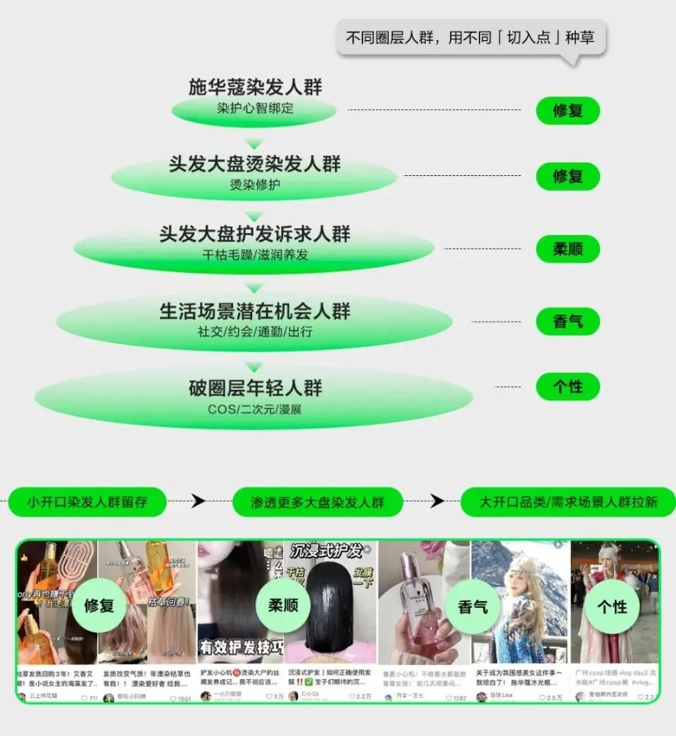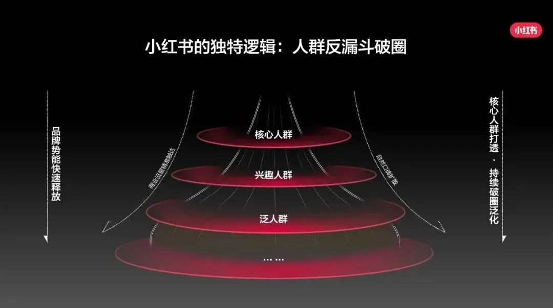 “方向对了之后,快速实现人群的渗透,产品成长期,帮助品牌从核心人群打到泛人群。成熟期,助力产品从单一场景打到多元场景。最终实现的就是增量人群的扩充和使用频次的提升。”又思说。据他介绍,当前小红书在人群和场景拓展的过程中是十分明确的,反漏斗模型一层一层触达的过程中,围绕关键词做策略牵引,结合产品能力,分析不同圈层人群可能存在的各种需求。施华蔻在和小红书合作的过程中,便抓住了站内用户高端护发需求的增长,将最新的护发产品设定为主推品,瞄准染发人群为“漏斗尖”的核心人群。此后,外围扩散中抓住了修复卖点,从施华蔻本身染发人群的修复入手,扩散至大盘染发修复人群,再扩散至有柔顺诉求的泛人群和追求香气的更外围社交人群。“所以说,人群和场景拓展的过程中,分享是最重要的用户行为。小红书的所有的商业价值都长在社区内,因为它的优质社区氛围,所以吸引了一部分更愿意表达、更愿意分享的用户,他们在分享过程中不断传递信息并获取正向交互,也助力着人群反漏斗模型中用户口碑的自然扩散,再加上商业流量的赋能,将口碑加速放大,最终都导向优质产品的经营爆发。”又思说。综合来看,小红书提出的“人群反漏斗模型”,是一件强依托于其社区生态的产物。在这个模型中,强大的真实内容库是一切传播的核心,精准的数据产品催动品牌寻觅到最核心“漏斗尖”人群,KFS等广告模型起到加速器的作用,优质社区氛围激发UGC内容诞生和口碑扩散导向销量爆发。
